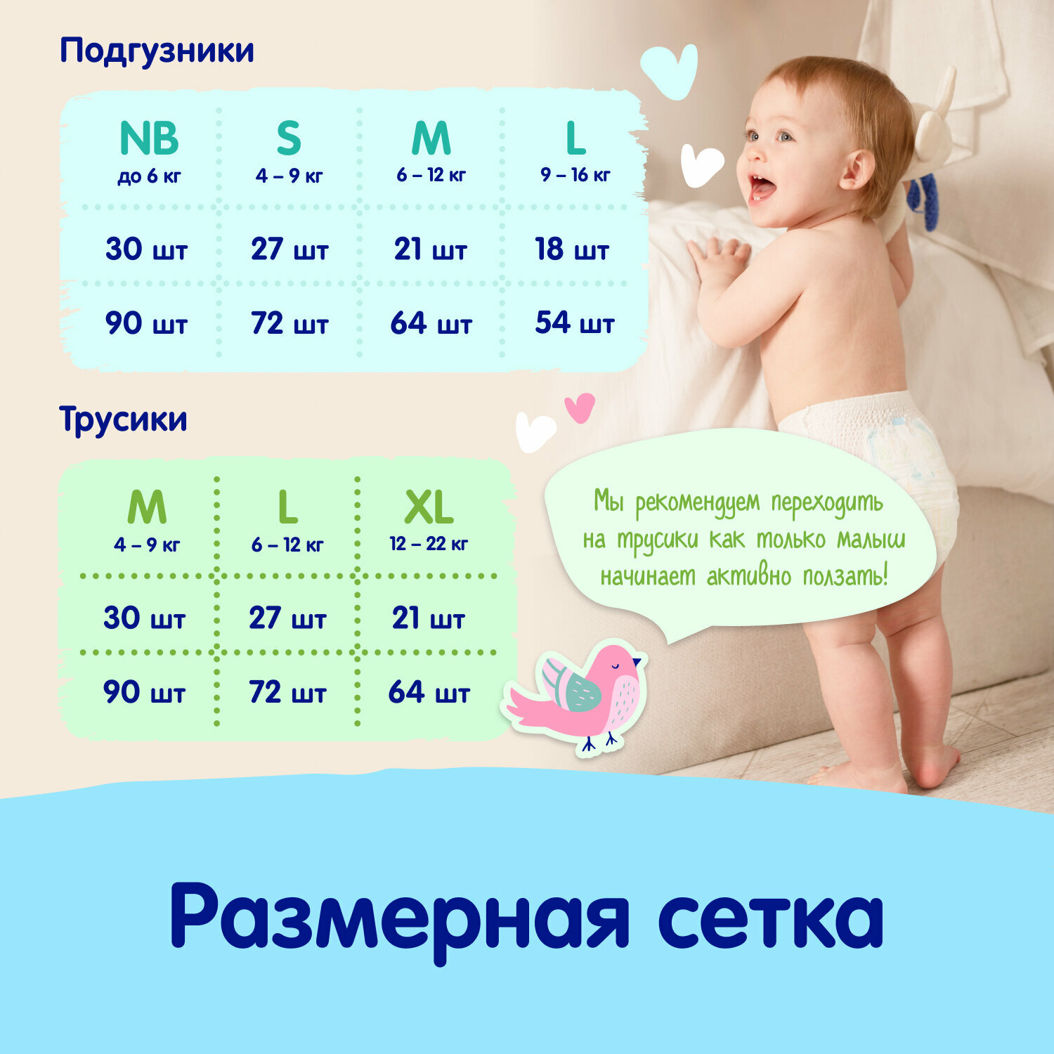 | Отзыв: | Ребенок 10,5 кг, но используем размер М (6-11), хотя производители обычно рекомендуют переходить на следующий размер на нижней границе. Но эти трусики довольно вместительные, еще запас даже есть. Возможно, большемерят.