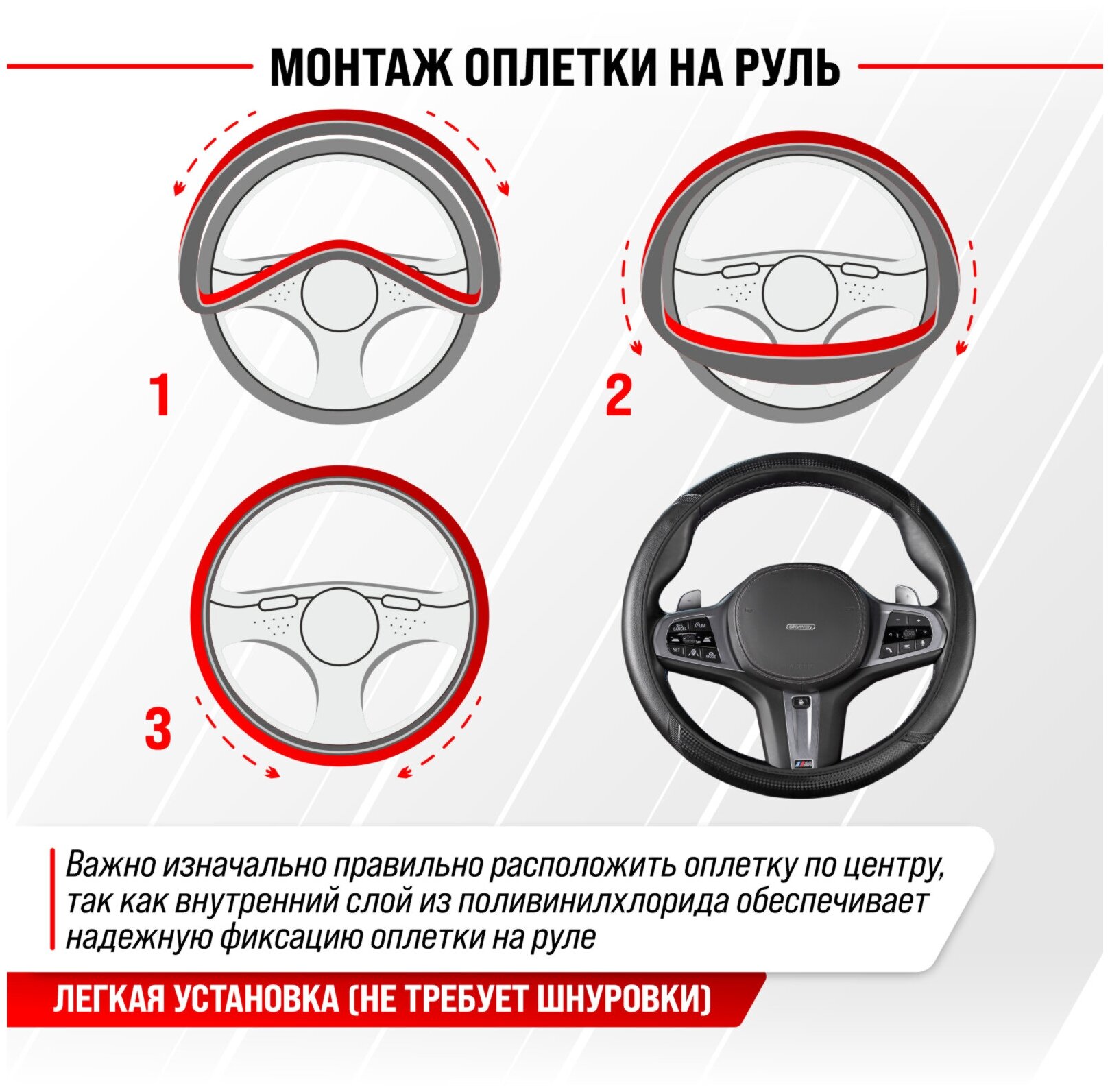 | Дополнительная информация | Рекомендации производителей: выбирайте оплётку под размер вашего рулевого колеса. Неверно выбранный размер может стать причиной проскальзывания оплётки или привести к невозможности снять или надеть её на руль. |