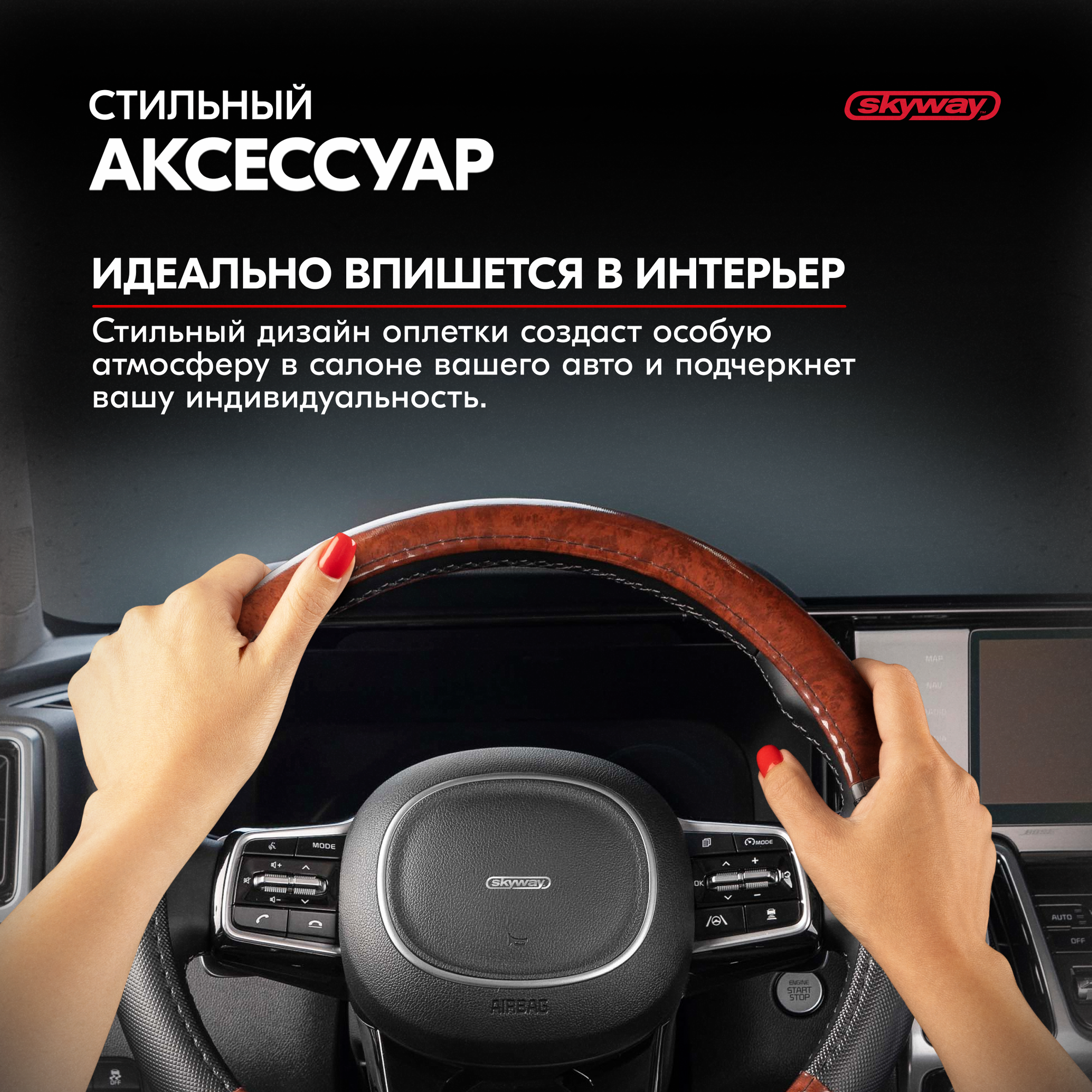 Оплетка руля SKYWAY Wood-6, экокожа, черный/коричневый, M, 37/38/39 см, S01102170