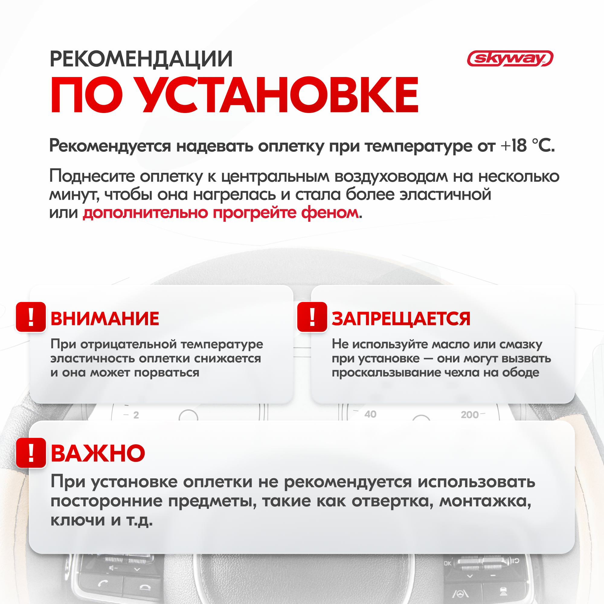 | Дополнительная информация | Рекомендации производителей: выбирайте оплётку под размер вашего рулевого колеса. Неверно выбранный размер может стать причиной проскальзывания оплётки или привести к невозможности снять или надеть её на руль. |