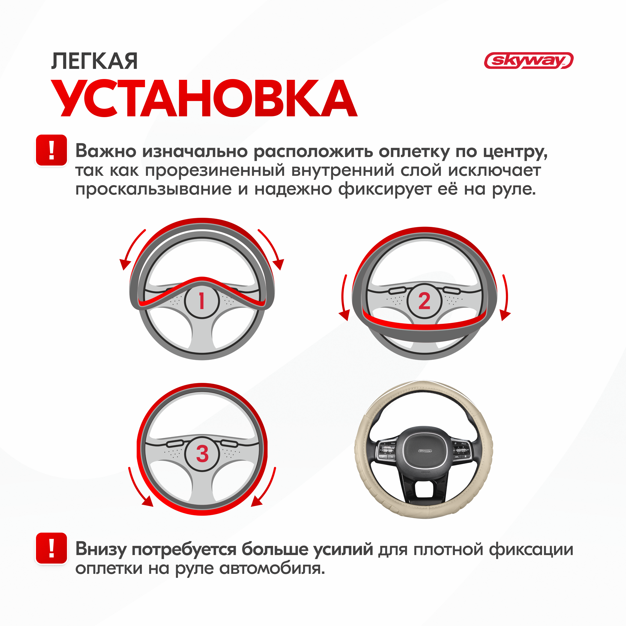 | Дополнительная информация | Рекомендации производителей: выбирайте оплётку под размер вашего рулевого колеса. Неверно выбранный размер может стать причиной проскальзывания оплётки или привести к невозможности снять или надеть её на руль. |