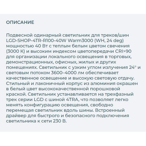 СохранитьСветильник LGD-SHOP-4TR-R100-40W Warm3000 (WH, 24 deg) (Arlight, IP20 Металл, 5 лет) интересное: