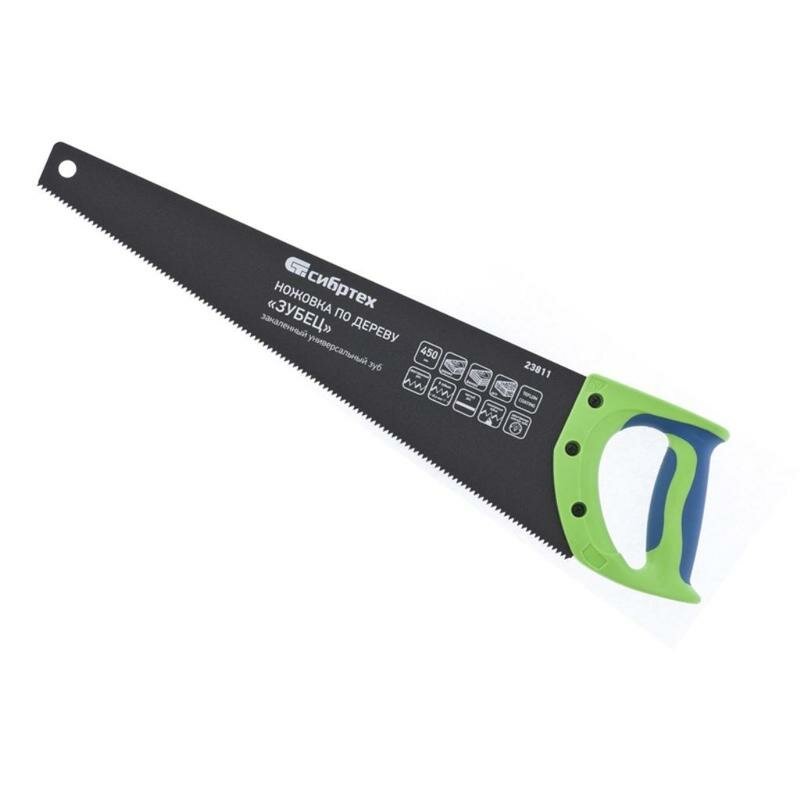 Ножовка по дереву "Зубец", 450 мм, 7-8 TPI, зуб 2D, кал.зуб, защ. покр., 2-х комп. рук-ка, СИБРТЕХ 23811