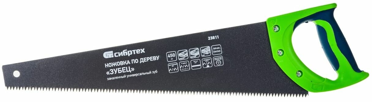 Ножовка по дереву "Зубец", 450 мм, 7-8 TPI, каленый зуб 2D, защитное покрытие, двухкомпонентная рукоятка Сибртех (23811)