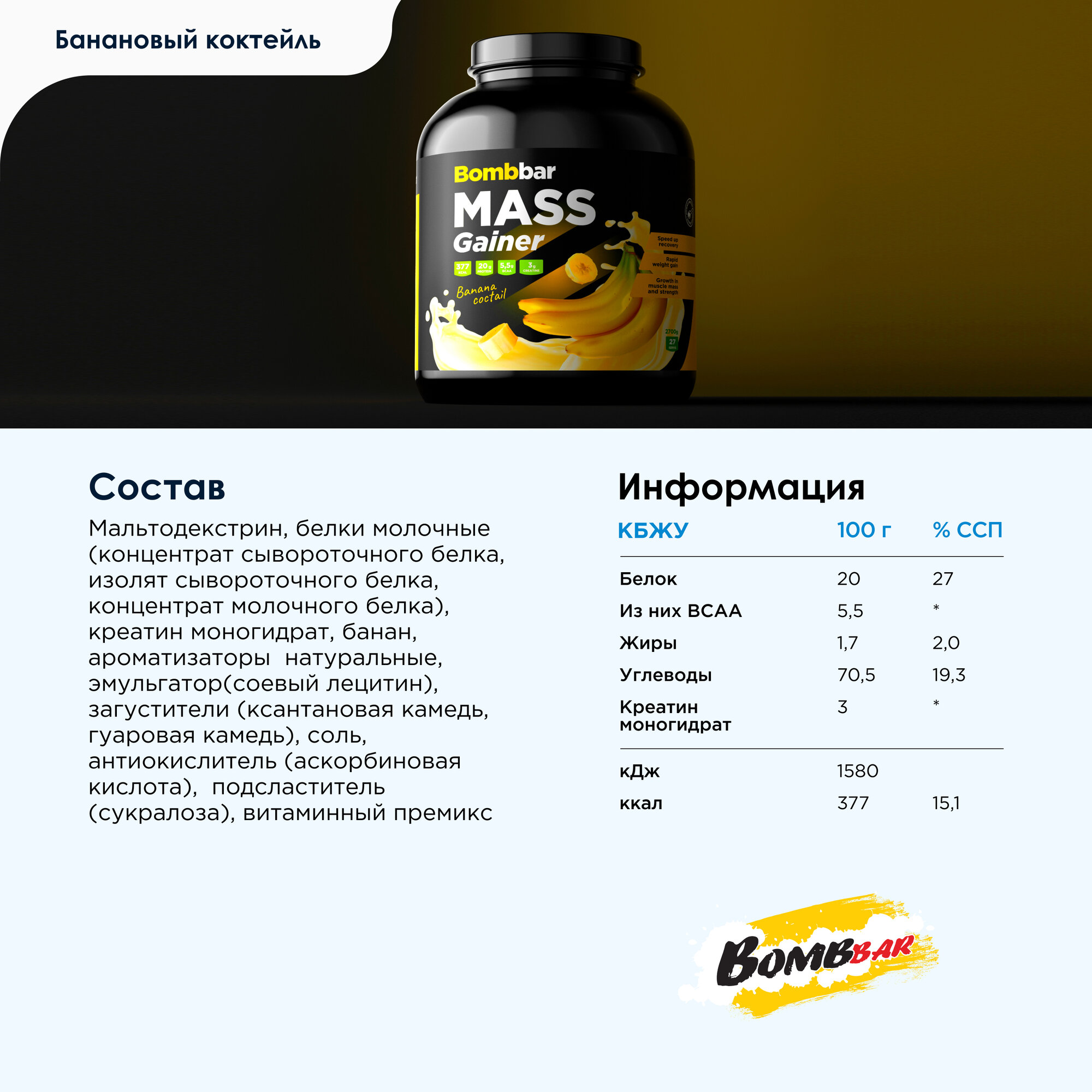 СохранитьBombbar Mass Gainer Pro Коктейль Гейнер для набора массы "Банановый коктейль", 2700г интересное: