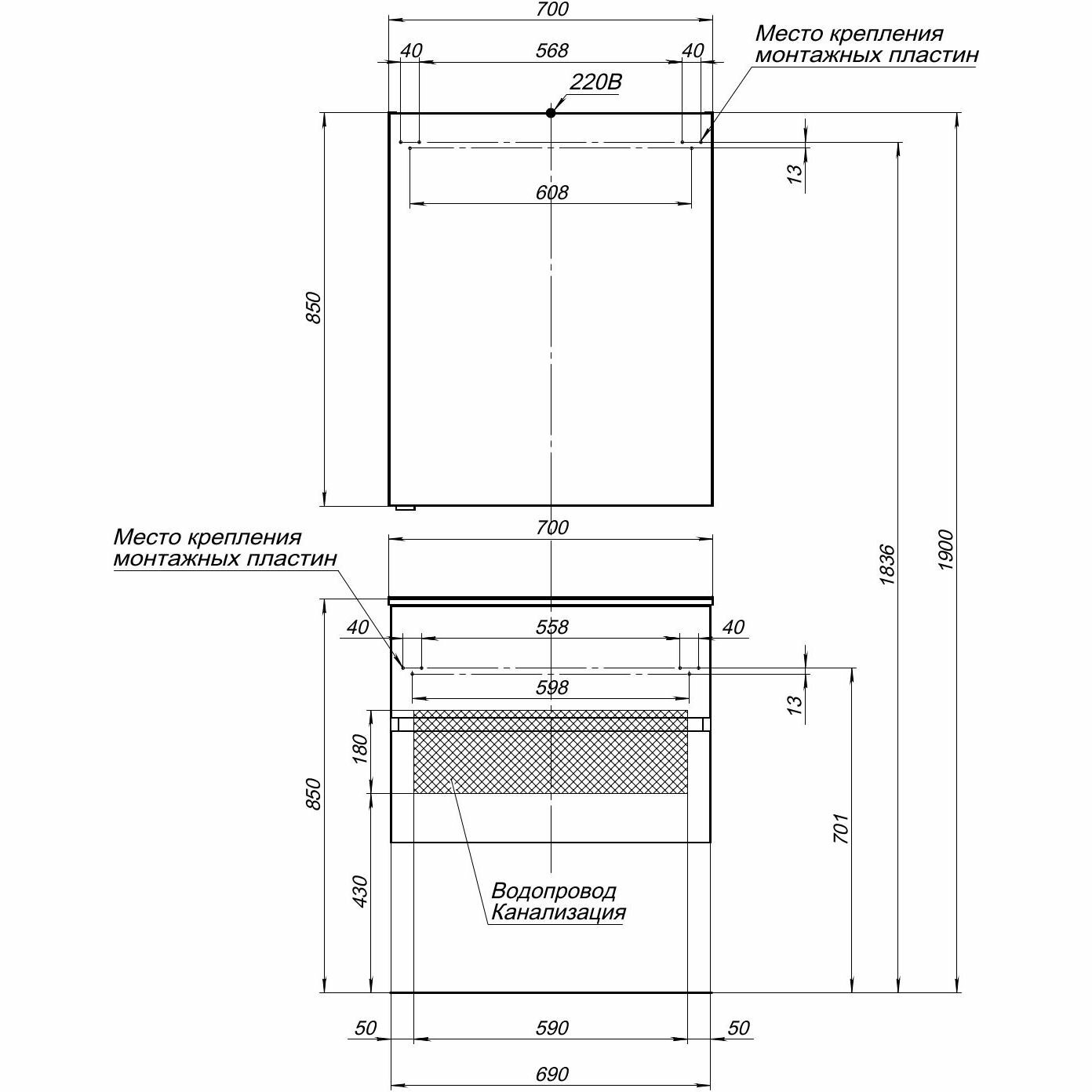 Тумба рассчитана на вывод труб из стены - за ящиками есть место, но нижняя стенка сплошная. При подводе труб/шлангов снизу потребуется самостоятельно прорезать отверстие. Направляющие для ящиков сделаны из толстого металла, но ящики необходимо крепить к ним саморезами. Закручивать саморезы необходимо с максимальным заглублением, иначе головки будут цепляться за стенки тумбы. Тумба навешивается на металлические зацепы, раковина просто кладется на нее. Ящики рекомендуется устанавливать в самом конце, после подключения и тестирования крана. |