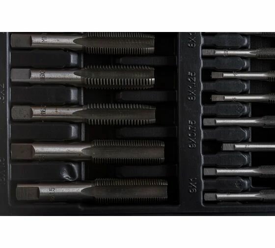 | Подробная комплектация | - 35 плашек и 35 метчиков комплектных из 2 штук: M2x0.4, M3x0.5, M4x0.7, M5x0.8, M6x0.75, M6x1.0, M7x0.75, M7x1.0, M8x0.75, M8x1.0, M8x1.25, M9x0.75, M9x1.0, M9x1.25, M10x0.75, M10x1.0, M10x1.25, M10x1.5, M11x0.75, M11x1.0, M11x1.25, M11x1.5, M12x0.75, M12x1.0, M12x1.25, M12x1.5, M12x1.75, M14x1.0, M14x1.25, M14x1.5, M14x2.0, M16x1.0, M16x1.5, M16x2.0, M18x1.5; - 2 метчикодержателя: M3-M12, M6-M20; - 2 плашкодержателя: ⌀25мм, ⌀32мм; - метчикодержатель Т-образный M3 - M6. |