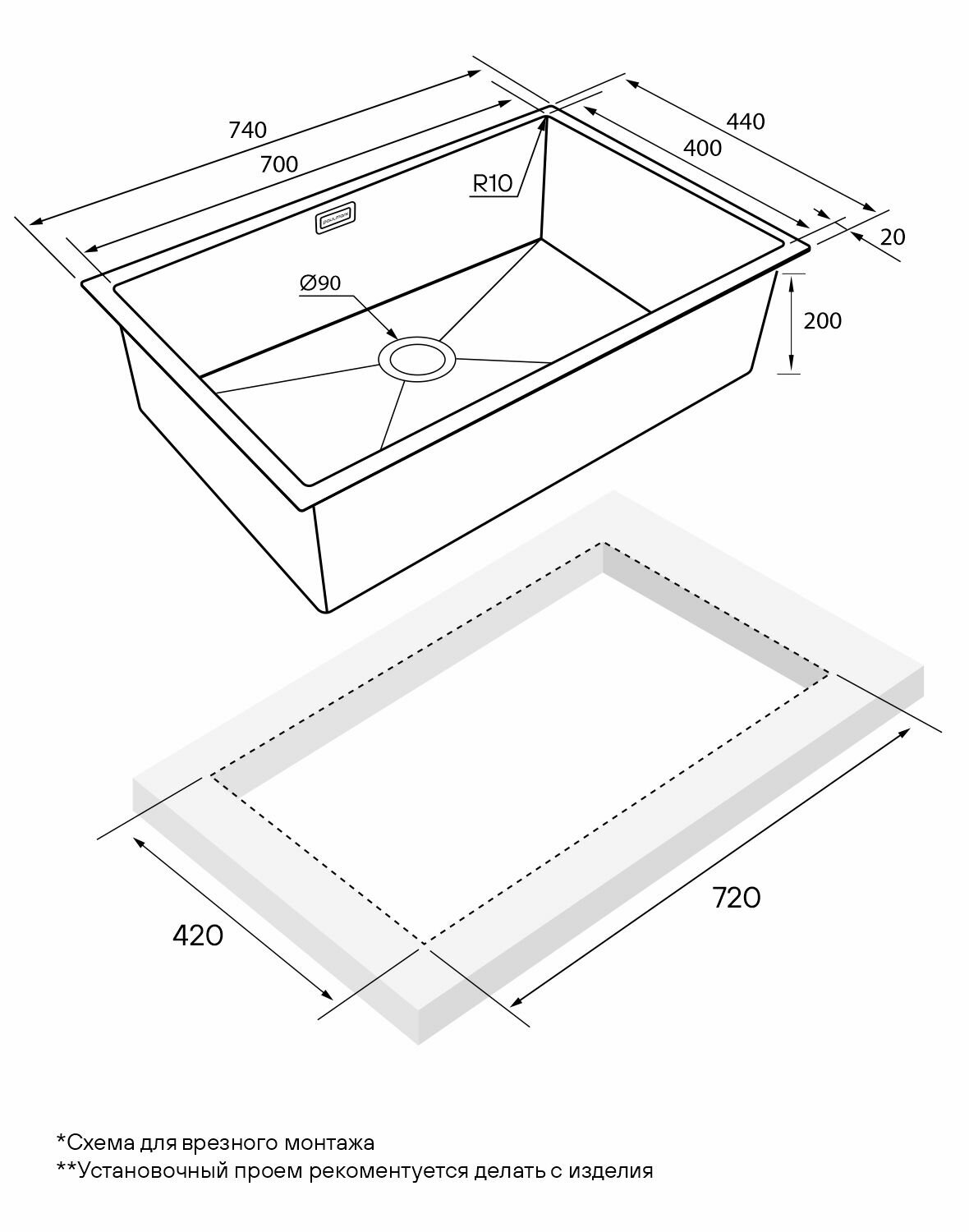 Мойка для кухни из нержавеющей стали AISI 304 Paulmark NEXT 74х44 врезная / подстольная, нержавеющая сталь (сатин), сифон, PM217444-BS
