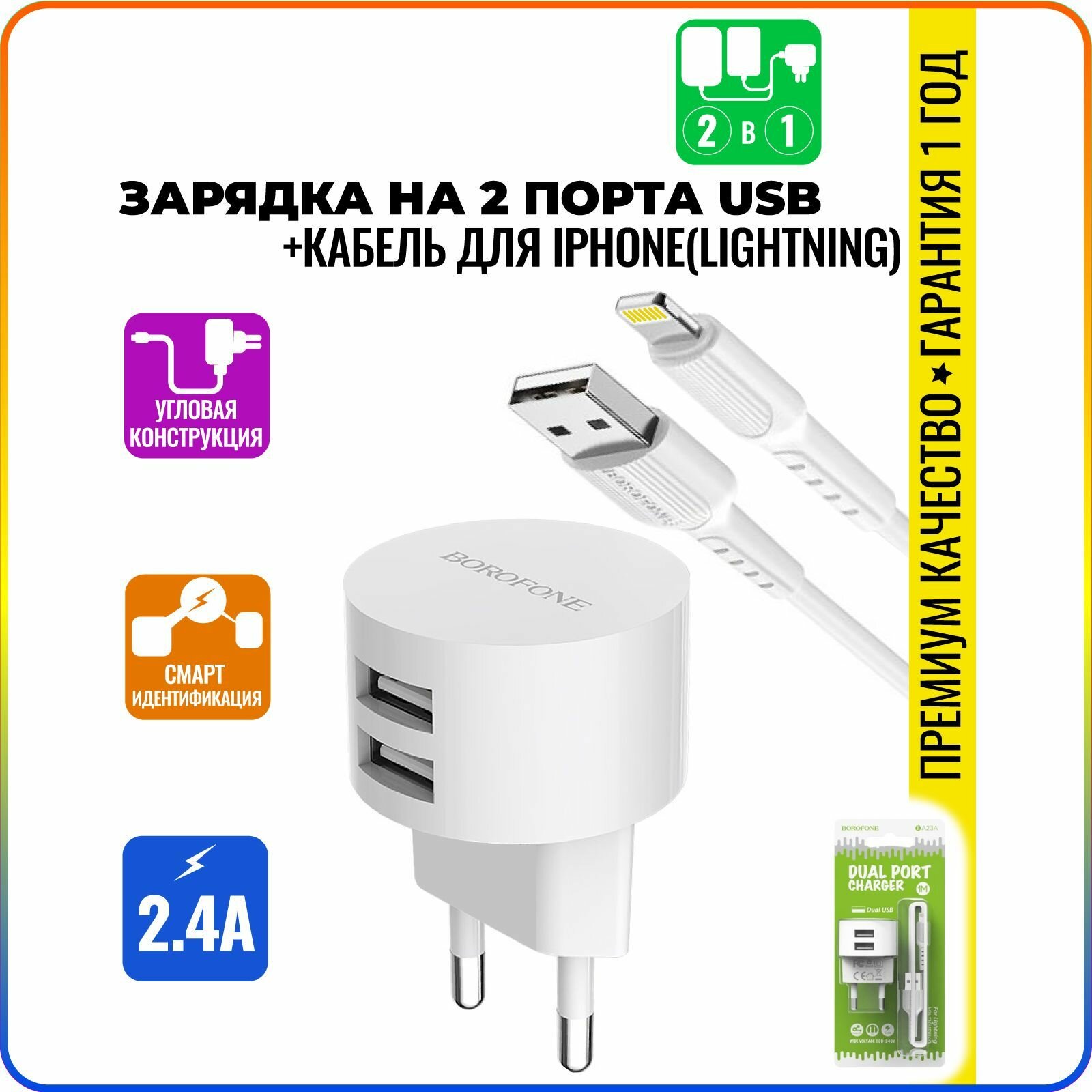 Сетевое зарядное устройство (СЗУ) Borofone BA23A (2 USB) + кабель Lightning, 2.4 А, белый