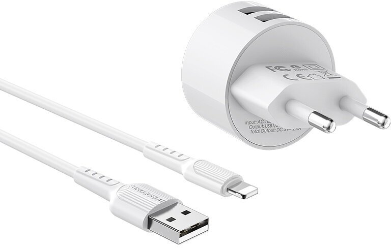 Сетевое зарядное устройство c 2 USB Borofone, BA23A, белое, Lightning