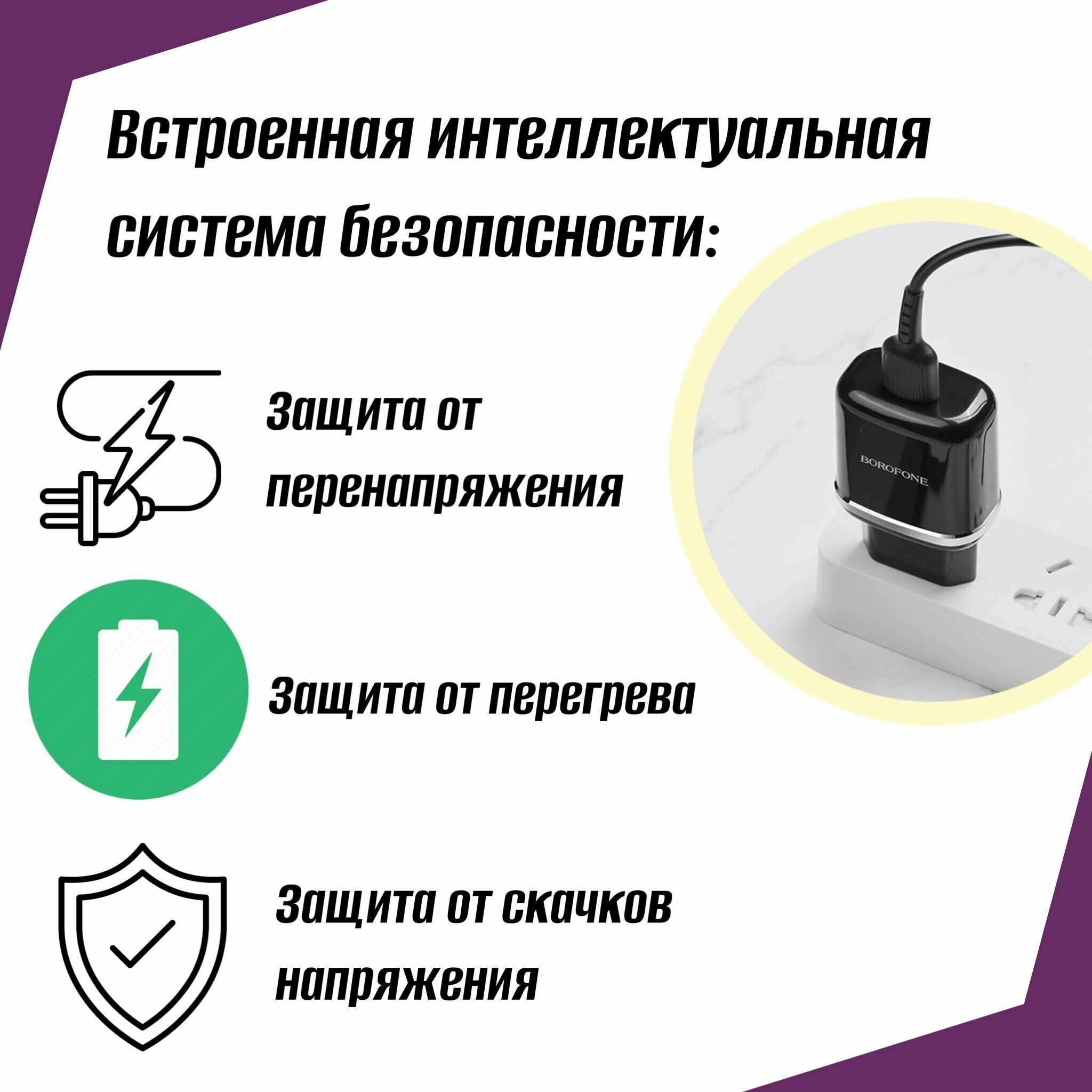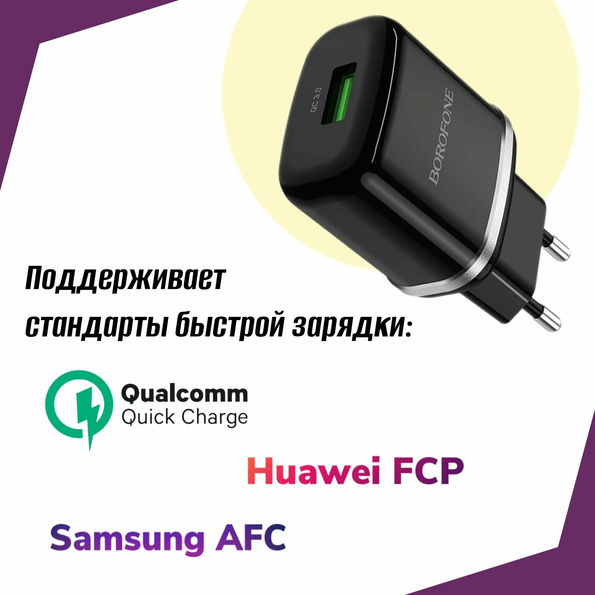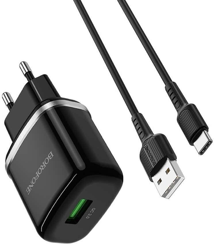 Сетевой адаптер питания Borofone BA36A HighSpeed Black зарядка 3A 18W QuickCharge3 1 USB-порт + кабель USB-C, черный