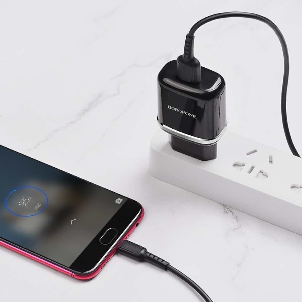 Сетевой адаптер питания USB-Af + кабель Type-Cm Borofone BA36A HighSpeed Black зарядка 3А 18W QC3.0 - чёрный