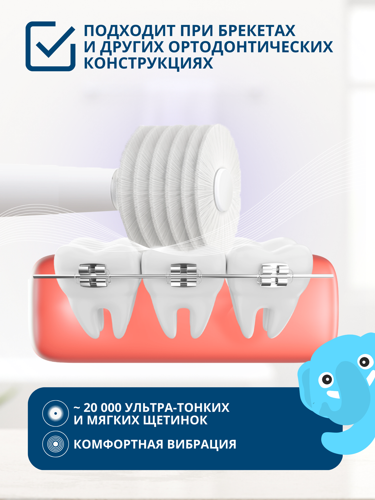 | Насадки | межзубная / мягкая / отбеливающая / стандартная / для всей поверхности; для очистки языка; для удаления налета; для чистки брекетов; для чувствительных зубов; ортодонтическая (для брекетов) |