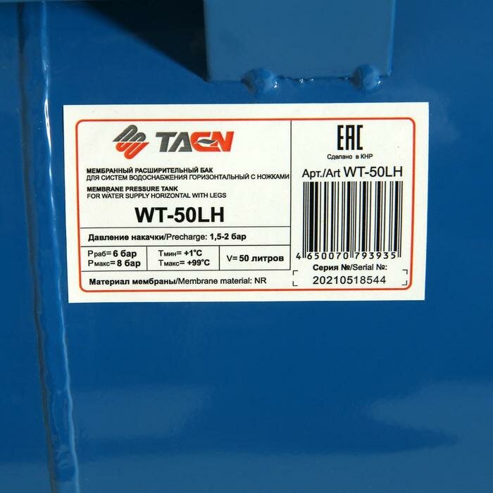| Дополнительная информация | давление воздуха в баке – 1.5 атм; рабочее давление – 4 атм; рабочая температура: от +2 до +90°С; бак оснащен сменной мембраной из EPDM (этилен-пропилен диен мономер); диаметр горловины мембраны – 95 мм |