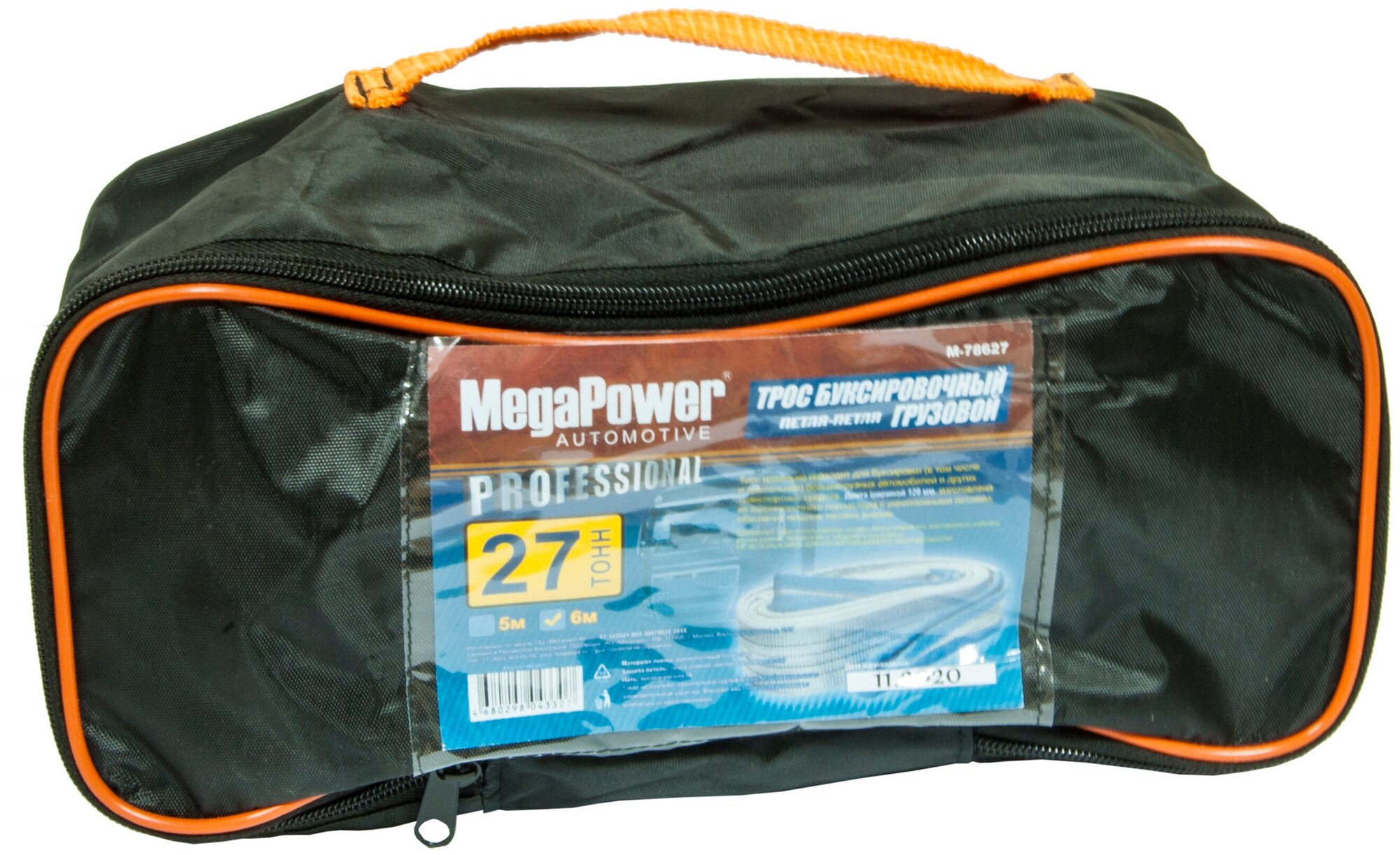 Купить Трос буксировочный грузовой M-78627 27000кг длина 6 метров, ширина ленты 120мм (петля-петля) в сумке MEGAPOWER