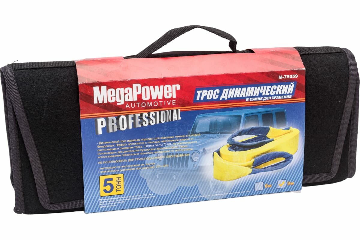 MEGAPOWER-AUTOMOTIVE M-75059 Трос буксировочный 5т 9м ленточный динамический (петля-петля) в сумке MEGAPOWER