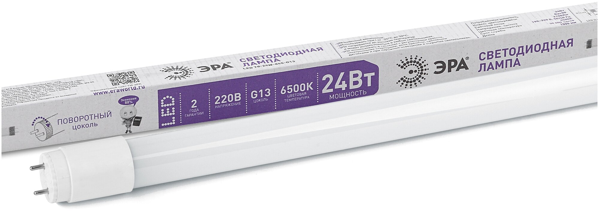 ЭРА стандарт T8 G13 220V 24W(1920lm) 6500K 6K 1500х26 (мат.стекло, поворот.) 3145