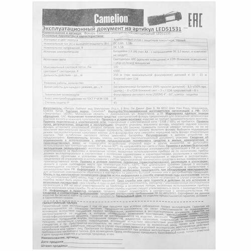 СохранитьФонарь Camelion, LED51531, алюминий, 4 режима, XPE+COB, ZOOM, 1XLR6, блистер, 14533 интересное: