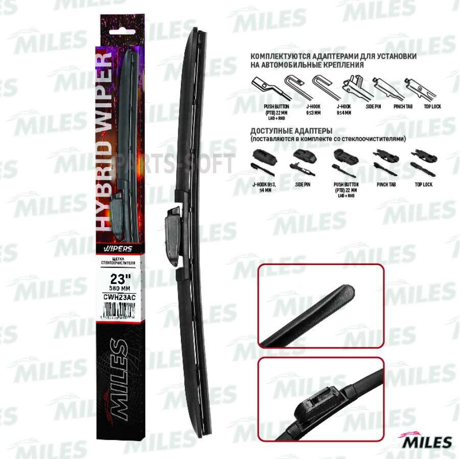 MILES CWH23AC Щетка стеклоочистителя гибридная 580мм (HOOK 9x3/9x4)/адаптер Side PIN/Push Button/Pinch Tab