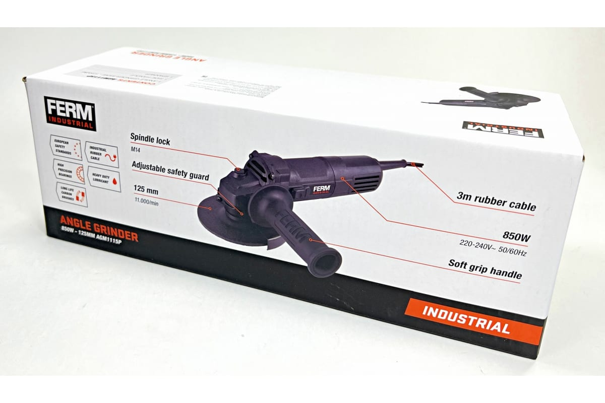 Болгарка, шлифовальная машина угловая УШМ FERM Industrial AGM1115P, 125 мм., 850 Вт., 12000 об.мин., коробка