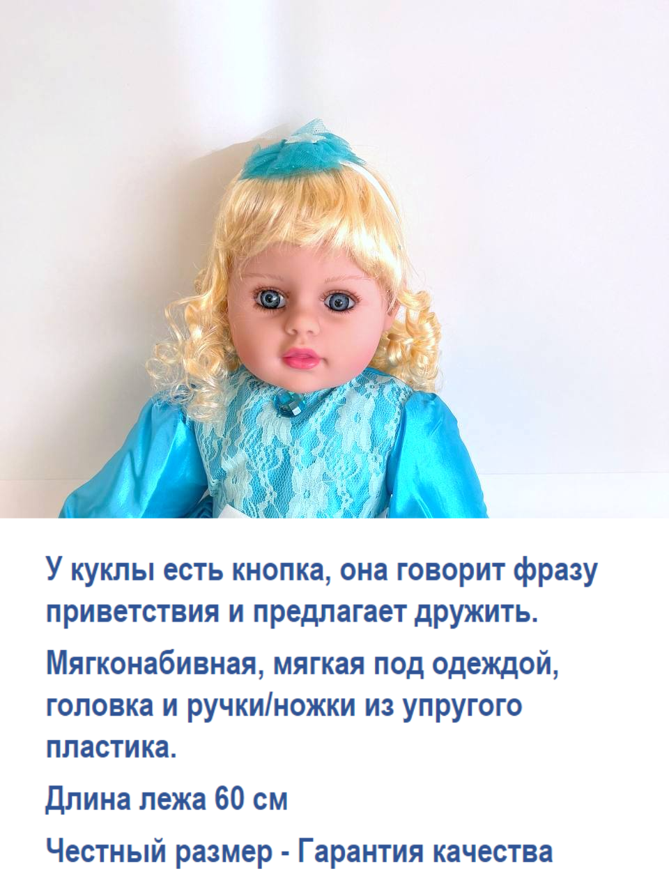 Большая кукла 60 см в синем кружевном платье, Реборн интерактивная в подарочной упаковке, говорит