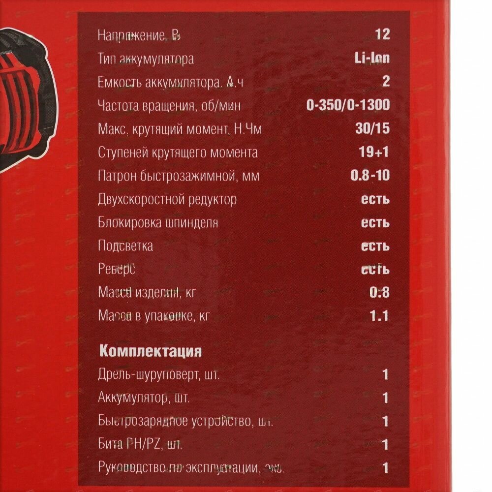 | Подробная комплектация | Дрель-шуруповерт - 1 шт, аккумулятор - 1 шт, быстрозарядное устройство - 1 шт, бита 50 мм, PH, PZ, - 1 шт, руководство по эксплуатации - 1 шт, инструкция по безопасности - 1 шт |