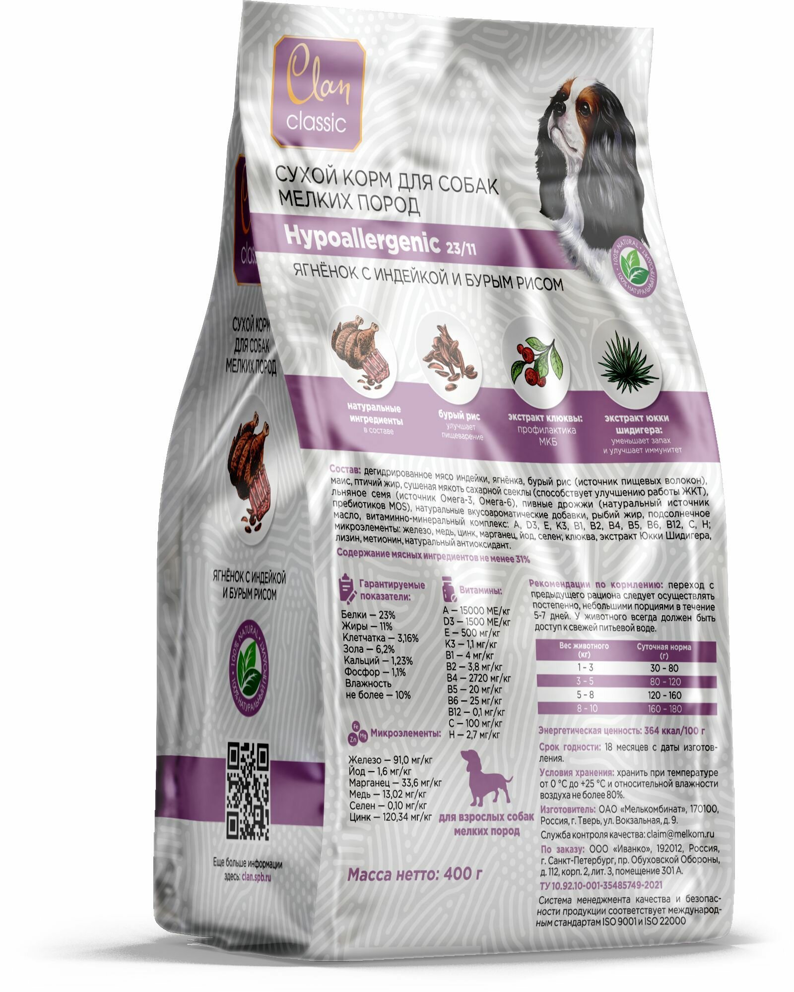 Clan Корм сухой для собак мелких пород Сlassic Hypoallergenic-23/11 ягненок, индейка, бурый рис, 400 г