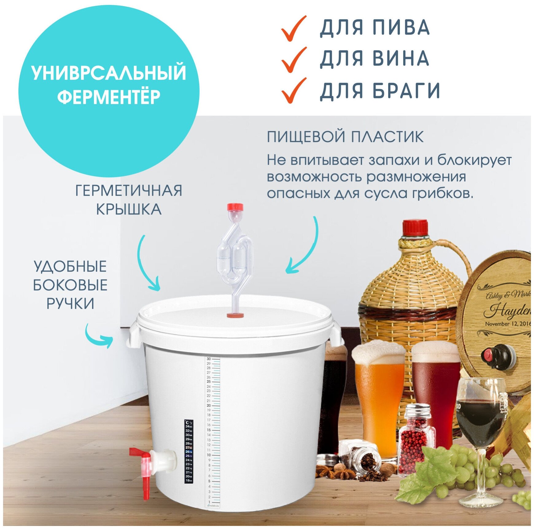 Пластиковая ёмкость - бак для брожения 30л / Готовый комплект для приготовления браги и пива / Ферментер. интересное: