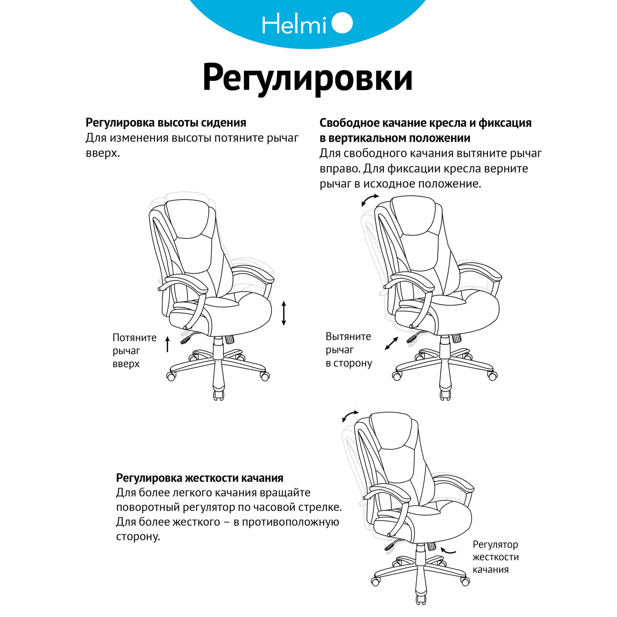 | Регулировка | высоты сиденья / жесткости качания / наклона спинки |