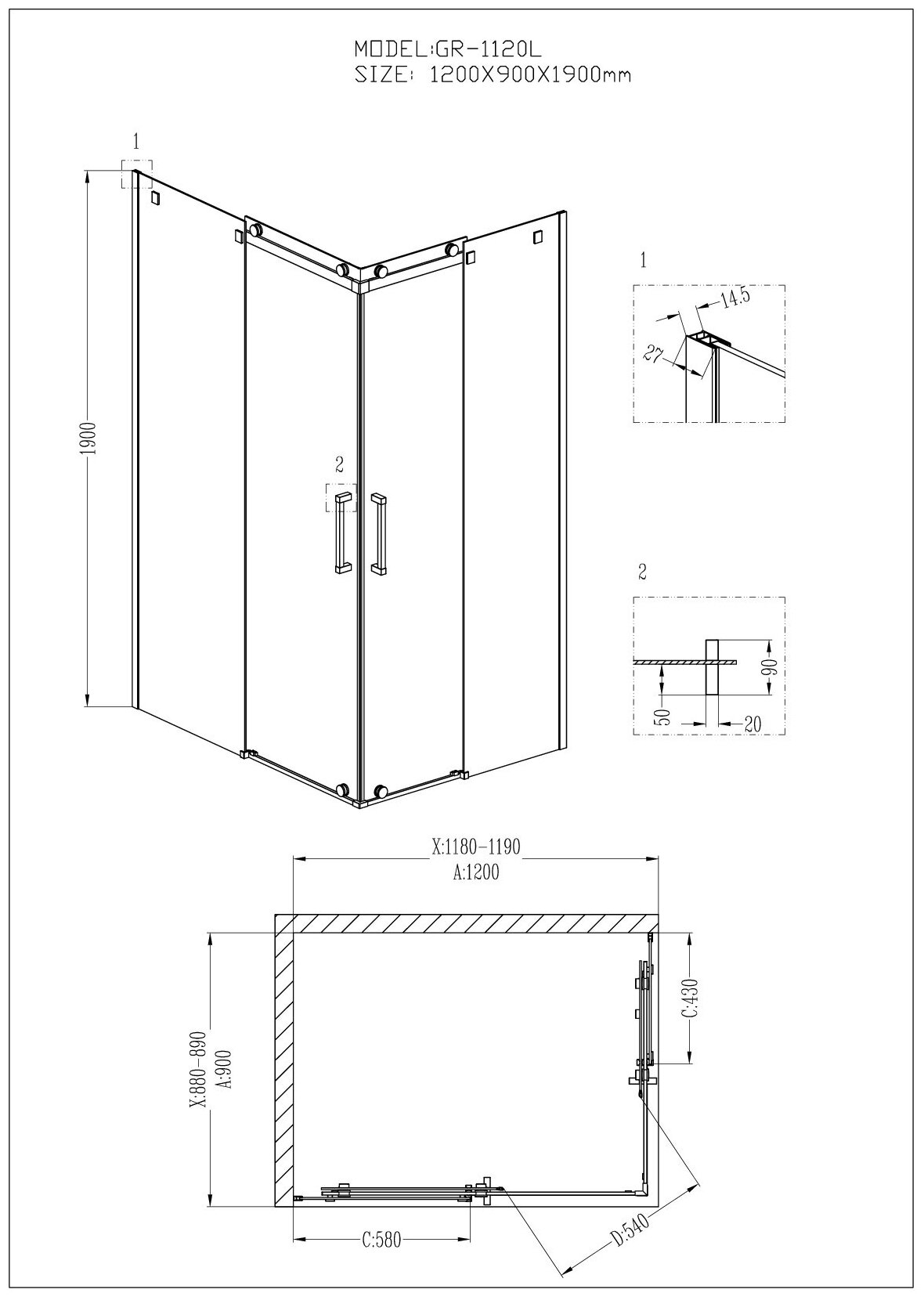 Душевое ограждение GROSSMAN GR-1120L Cosmo 120*90*190 прямоугольник, двери раздвижные