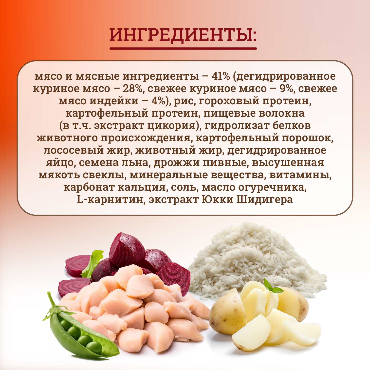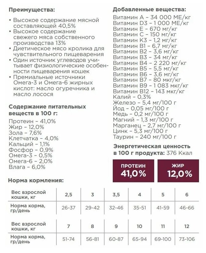 | Состав | Мясо и мясные ингредиенты – 40,5% (дегидрированное куриное мясо – 30,5%, свежее куриное мясо – 6%, свежее мясо кролика – 4%), рис, экстракт растительного белка, картофельный протеин, пищевые волокна (в т.ч. экстракт цикория), гидролизат белков животного происхождения, животный жир, семена льна, лососевый жир, дрожжи пивные, высушенная мякоть свеклы, минеральные вещества, соль, витамины, L-карнитин, масло огуречника, экстракт Юкки Шидигера. |