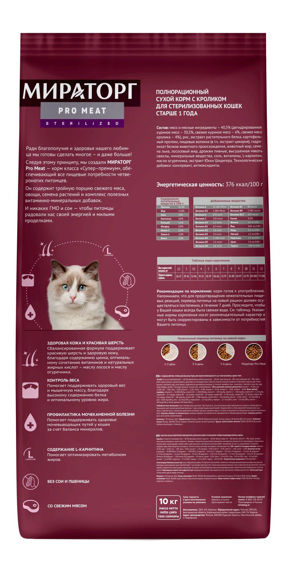 Корм Мираторг Pro Meat Sterilized для стерилизованных кошек, с кроликом, 10 кг