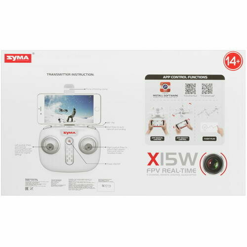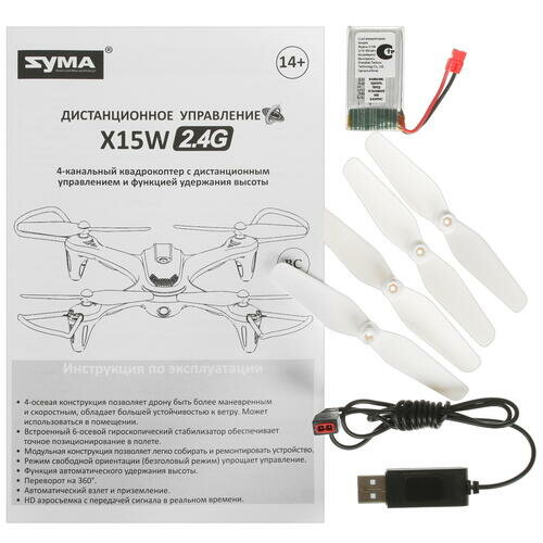 | Комплектация | Квадрокоптер «SYMA X15W» с WIFI камерой 480Р, Пульт управления 2.4 ГГц, Аккумулятор: Li-Po 3.7V 450mAh, WiFi камера, USB зарядное устройство, Кронштейн для крепления смартфона, Запасные пропеллеры, Отвертка |