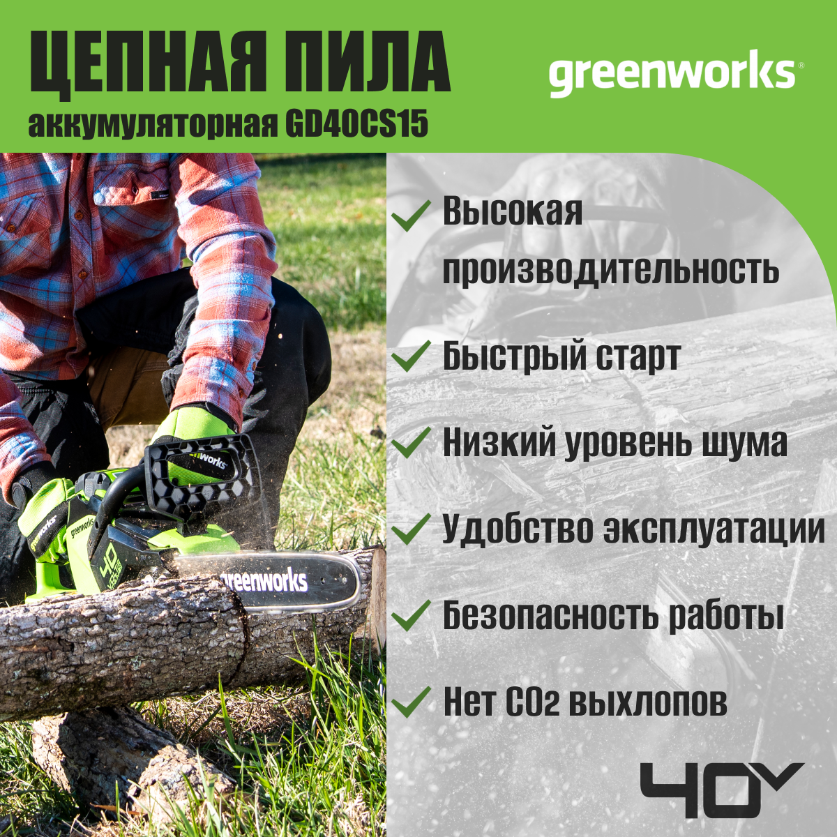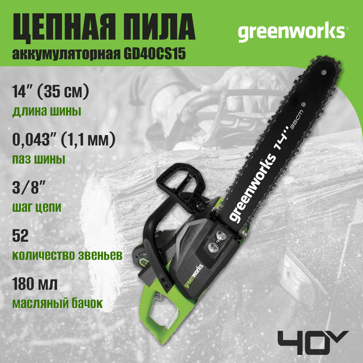 Пила цепная аккумуляторная Greenworks GD40CS15, 40V, 35 см, бесщеточная, до 1,5 КВТ, с АКБ 2АЧ и ЗУ