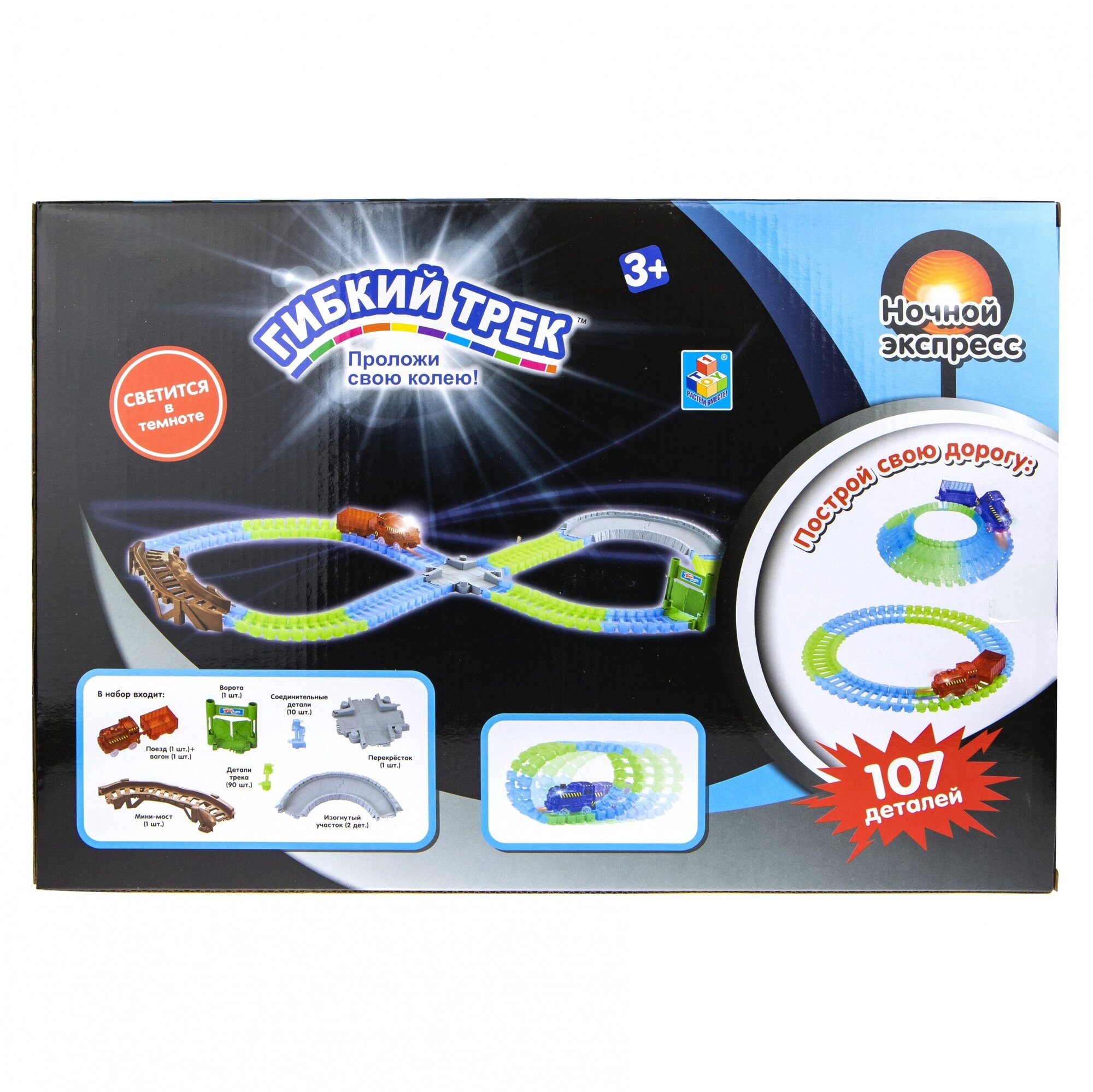 Купить 1toy гибкий трек "Ночной Экспресс", ворота, перекресток, мини-мост, паровоз со светом, 107 дет, дорога светится в темноте