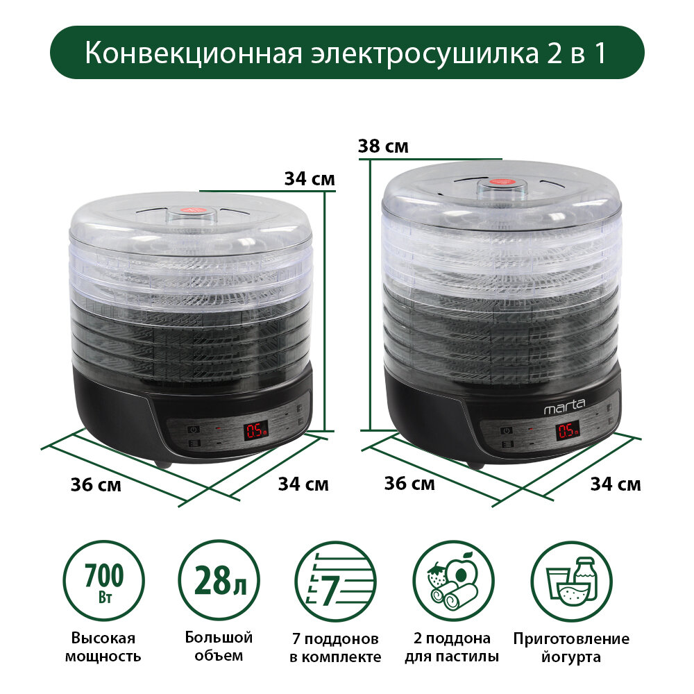 MARTA MFD-8207PS 9 поддонов 7 (3 разб)+2(пастила) темный обсидиан сушилка д/фруктов,овощей интересное:
