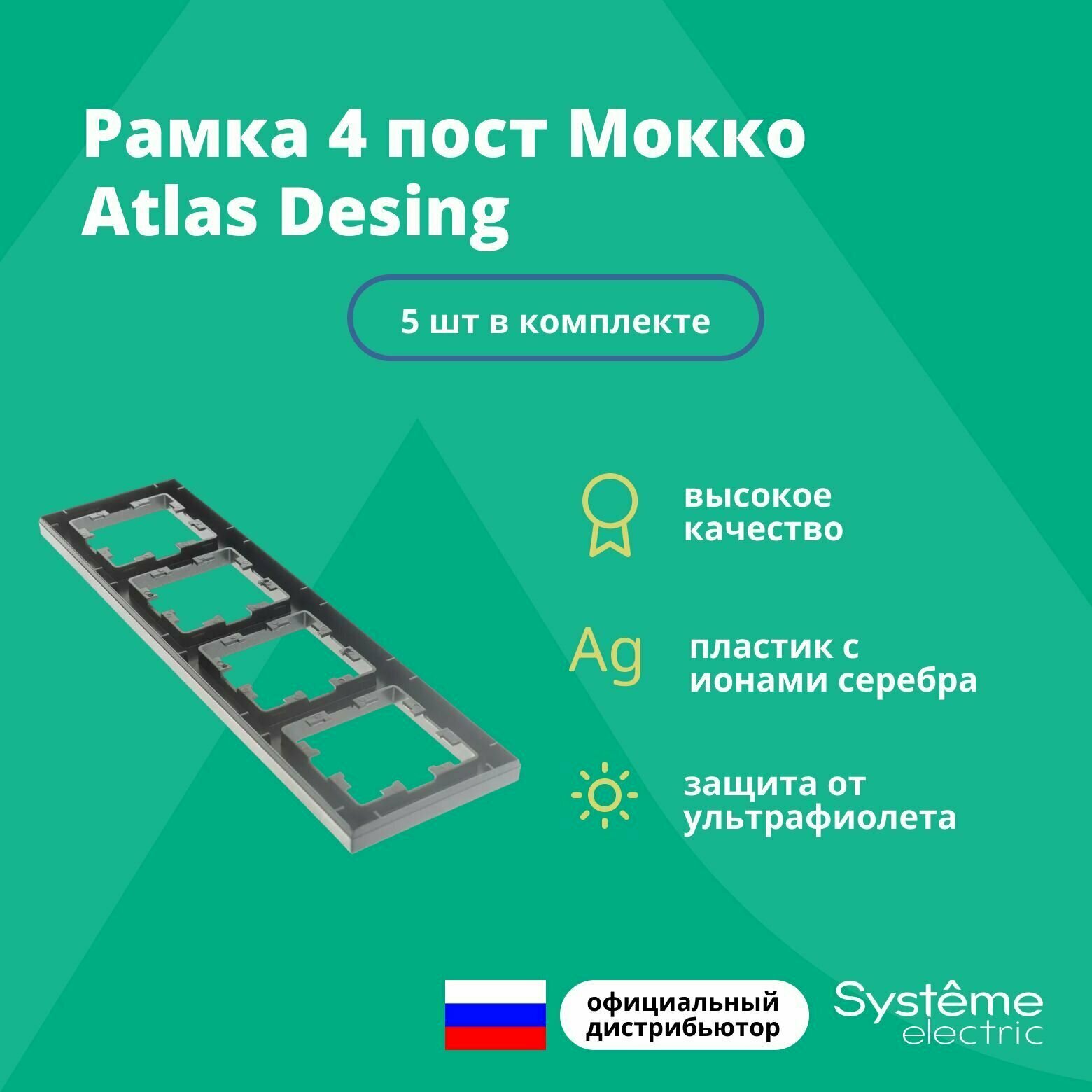 Купить Рамка для розетки выключателя четверная Schneider Electric (Systeme Electric) Atlas Design Антибактериальное покрытие Мокко ATN000604 5шт