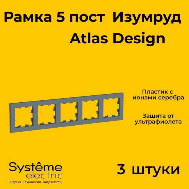 СохранитьРамка для розетки выключателя пятерная Schneider Electric (Systeme Electric) Atlas Design Антибактериальное покрытие Изумруд ATN000805 3шт интересное: