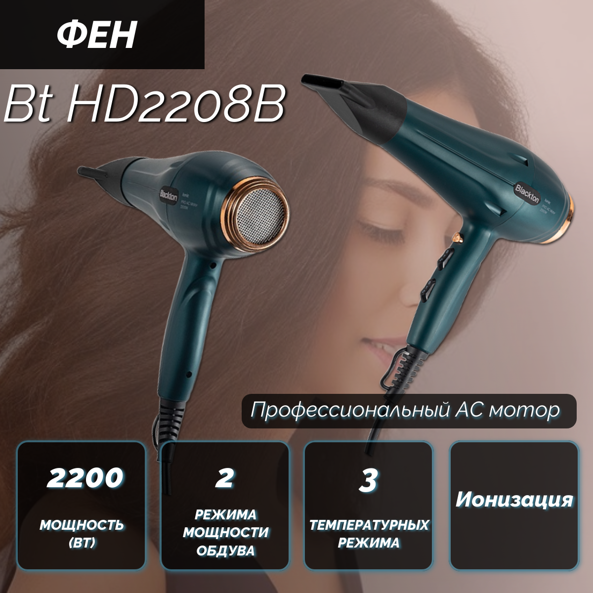 Фен Blackton Bt Hd2208b Dark-Green Профессиональный, Мощность 2200 Вт, Напряжение 220 В, 50 Гц, Регу .