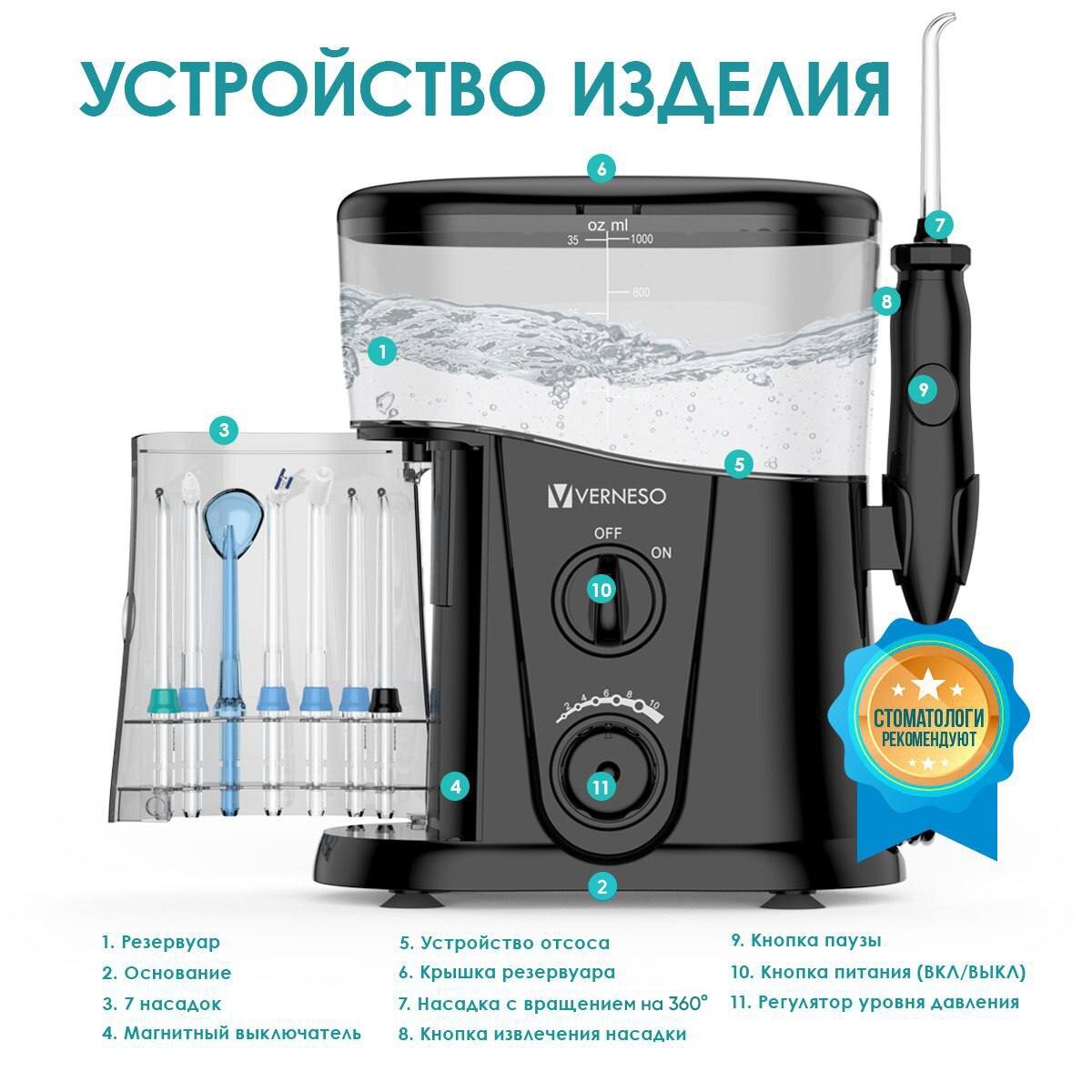 Ирригатор cтационарный для полости рта и отбеливания зубов, для чистки брекетов и языка, для десен, против зубного камня VERNESO, черный интересное: