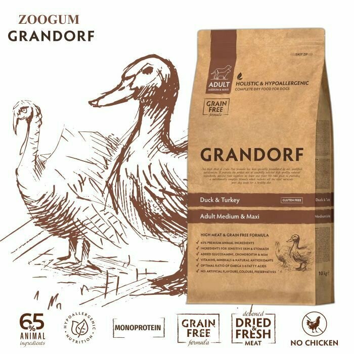 GRANDORF DOG Duck & Turkey MED & MAXI для собак средних и крупных пород, утка с индейкой 3кг.