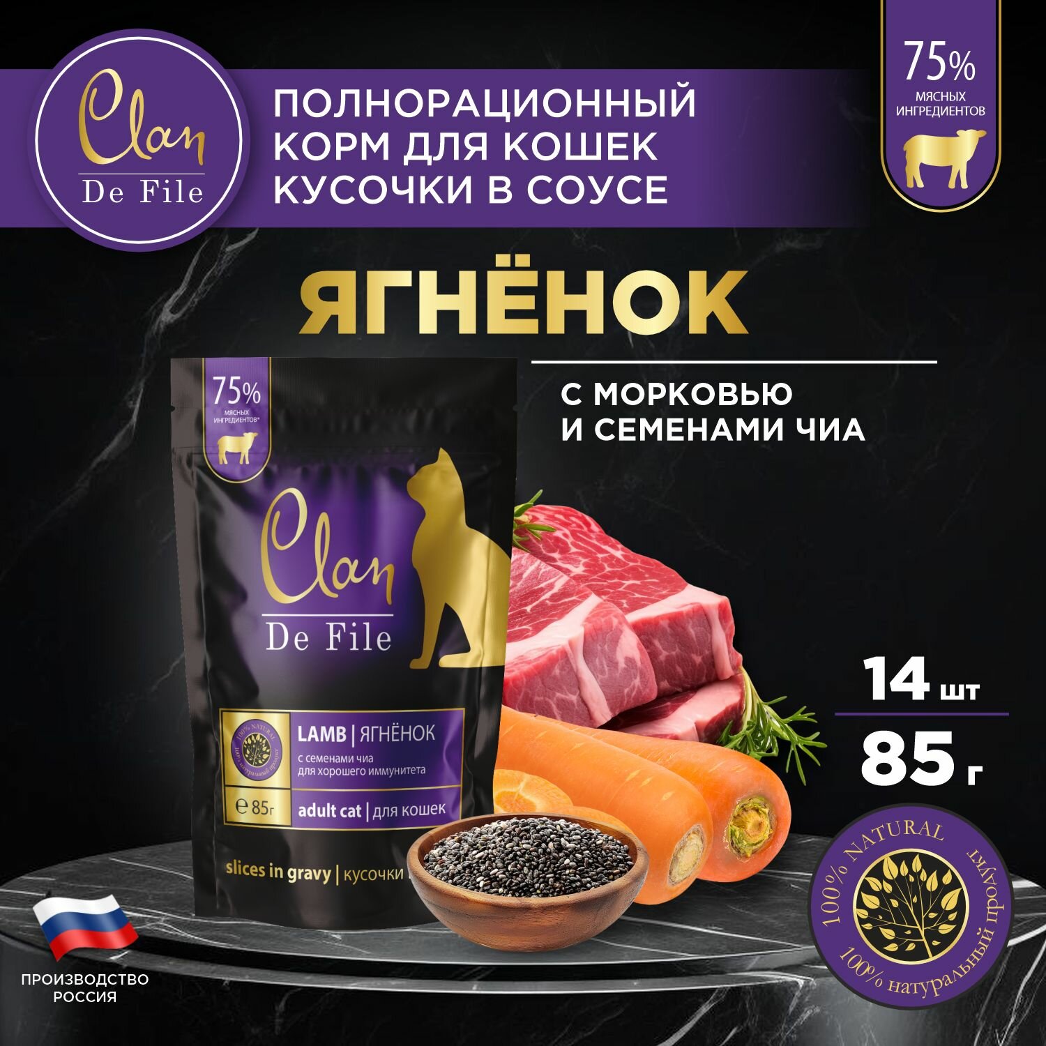 Влажный корм для кошек CLAN De File кусочки в соусе, Ягненок с семенами чиа, паучи 85г (14 шт.)