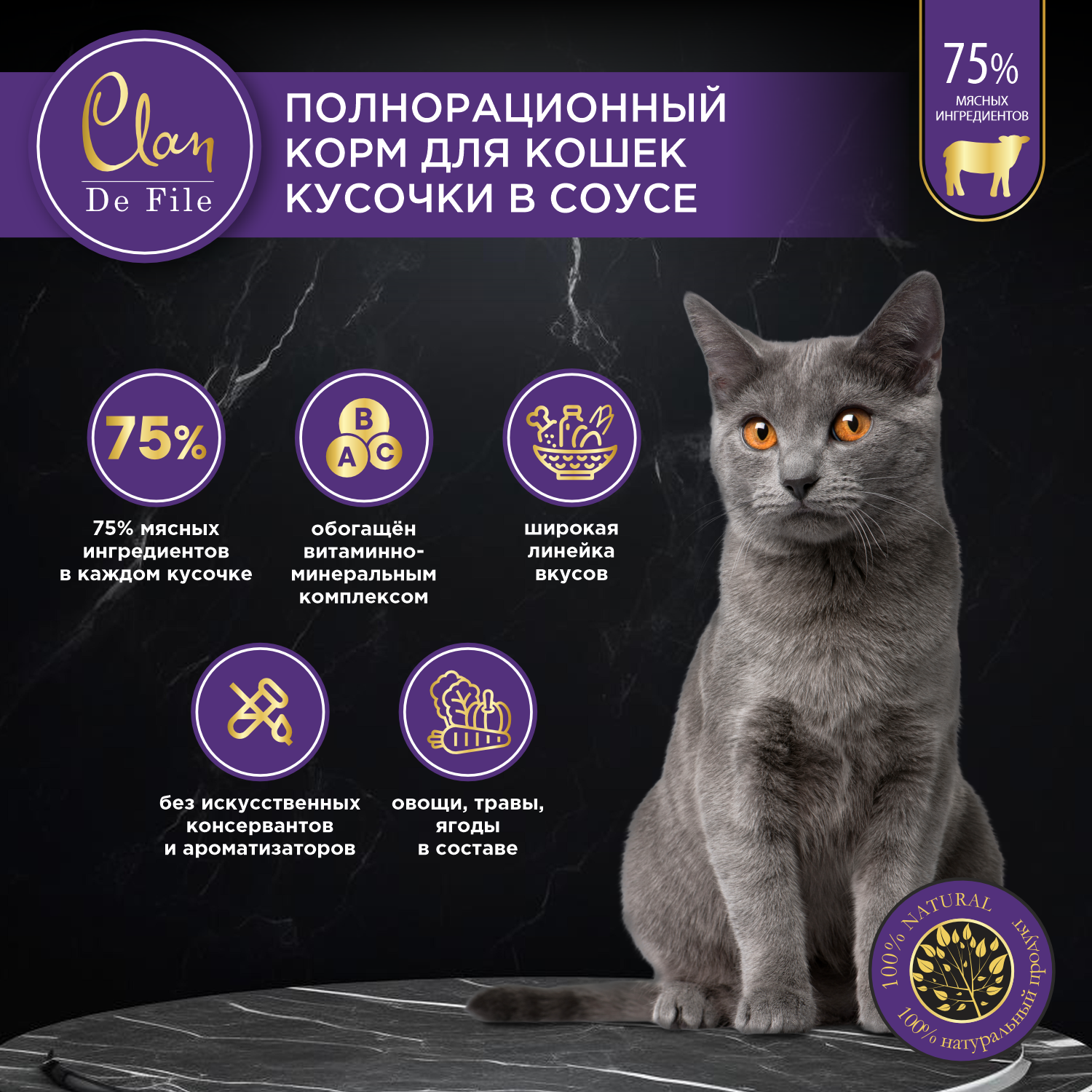 Влажный корм для кошек CLAN De File, ягненок с семенами чиа 14 шт. х 85 г (кусочки в соусе)