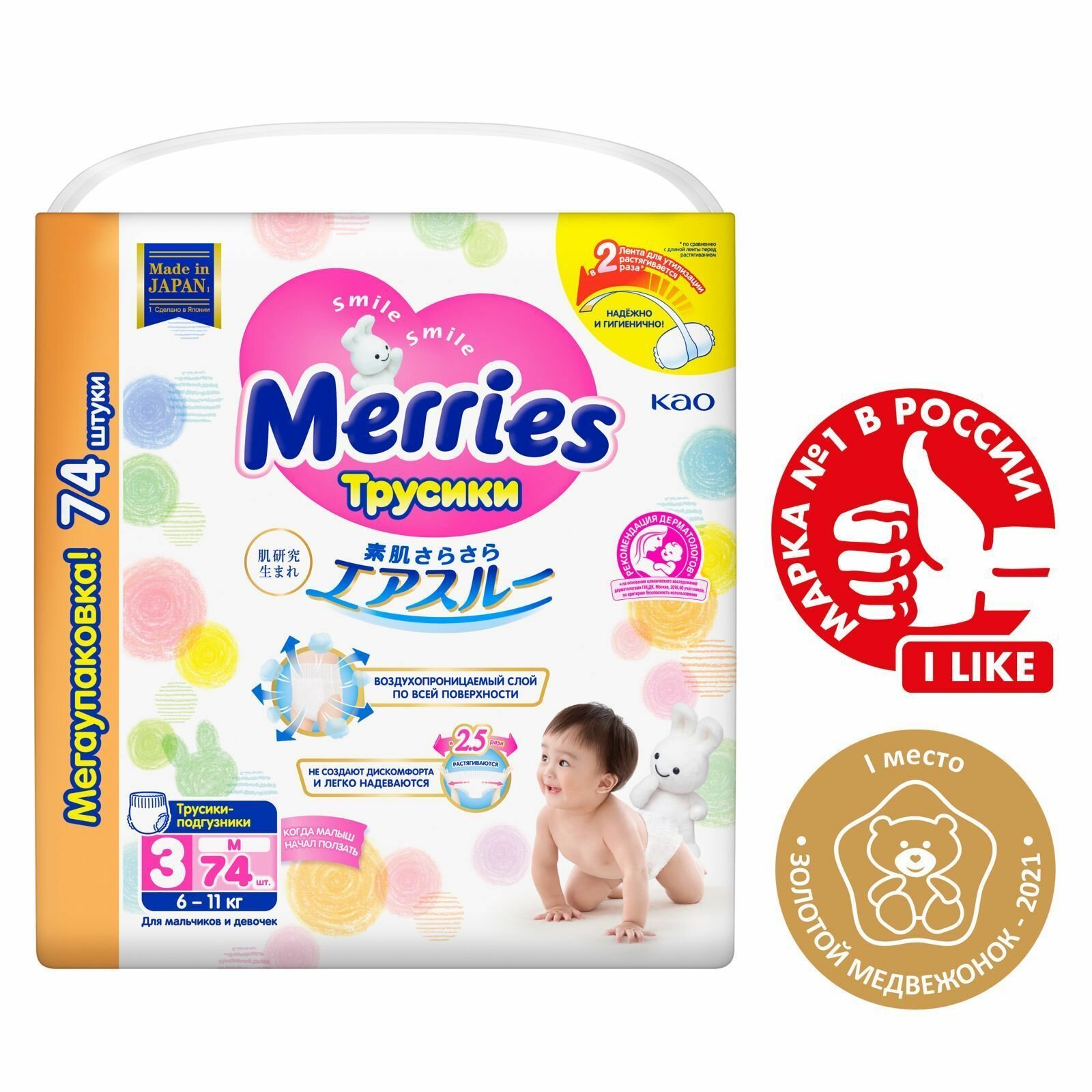 MERRIES Трусики - подгузники для детей размер М - 6-11 кг, 74 шт.