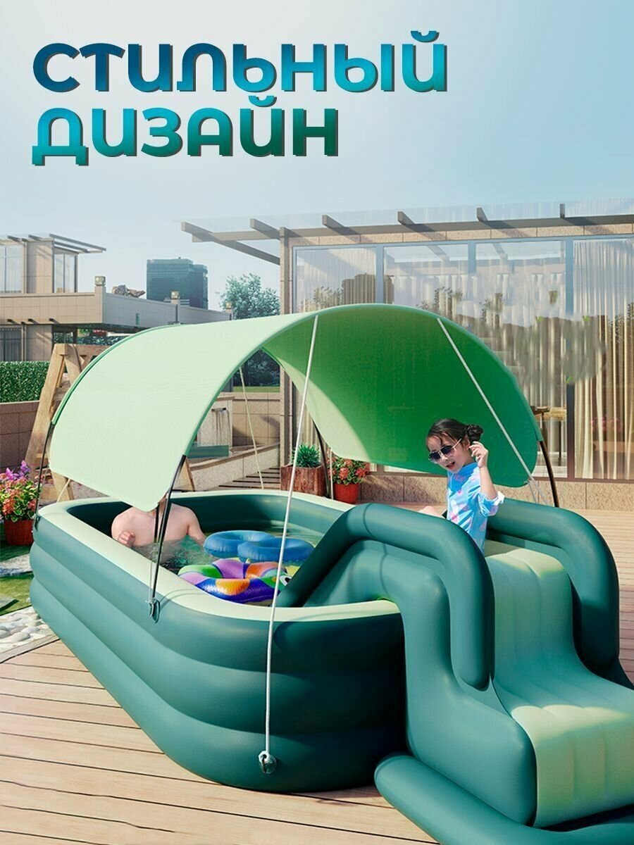 Бассейн детский надувной 2,1 м с крышей, лестницей, горкой и беспроводным насосом в комплекте