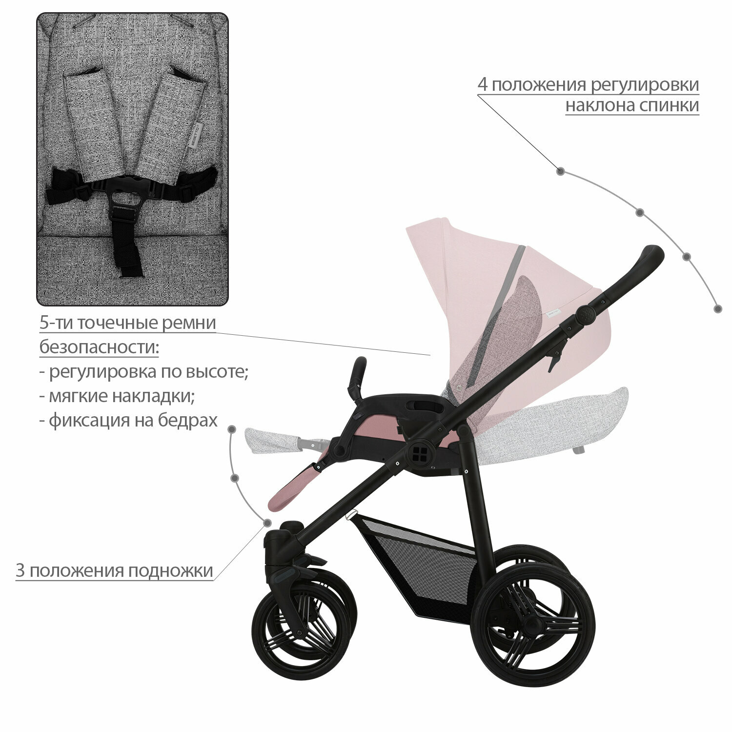 | Особенности шасси | корзина для покупок / перестановка блока лицом/спиной / регулировка высоты ручки / съемные колеса |