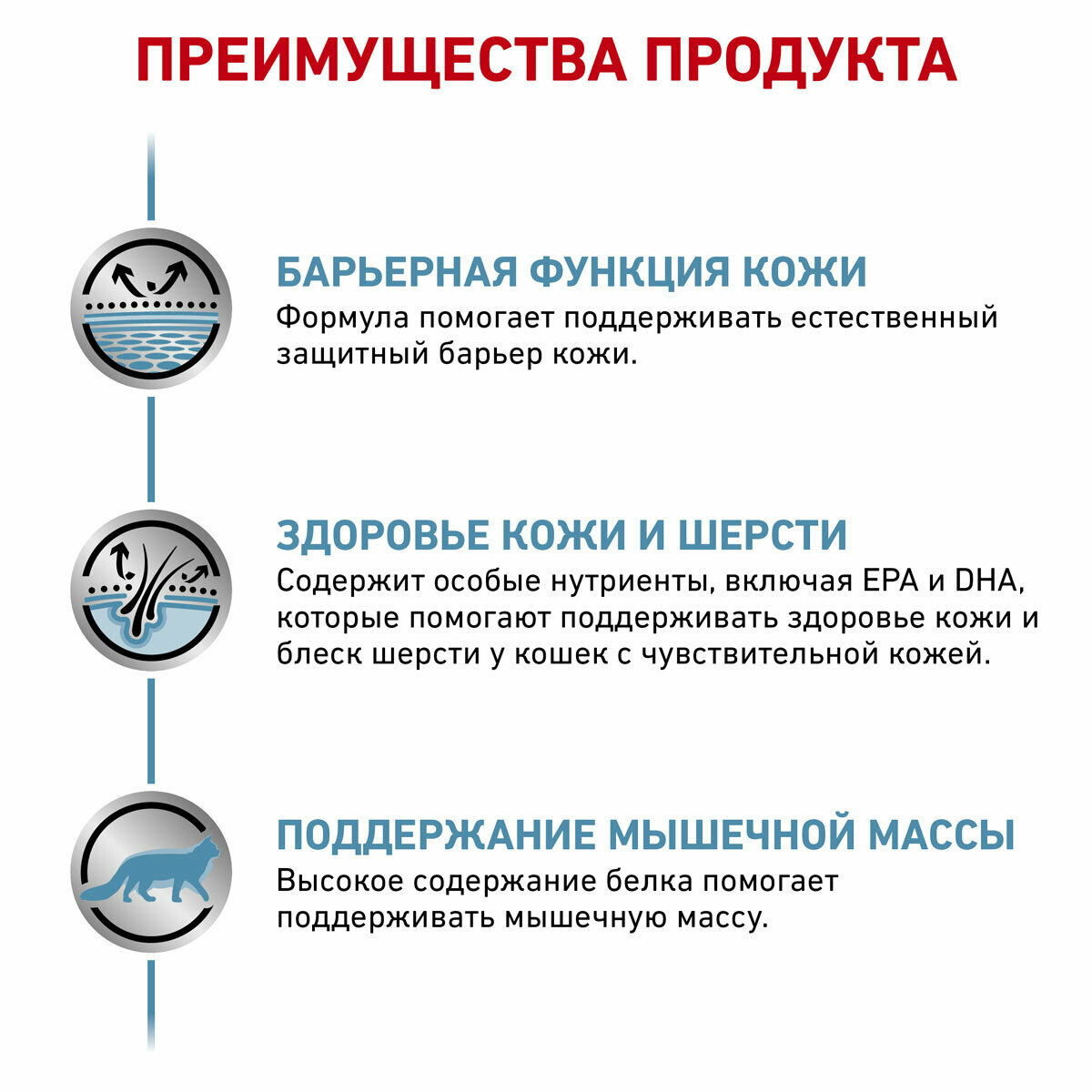 | Дополнительная информация | 1. Барьерная функция кожи Формула помогает поддерживать естественный защитный барьер кожи. 2. Здоровье кожи и шерсти Содержит особые нутриенты, включая EPA и DHA, которые помогают поддерживать здоровье кожи и блеск шерсти у кошек с чувствительной кожей. 3. Поддержание мышечной массы Высокое содержание белка помогает поддерживать мышечную массу. |