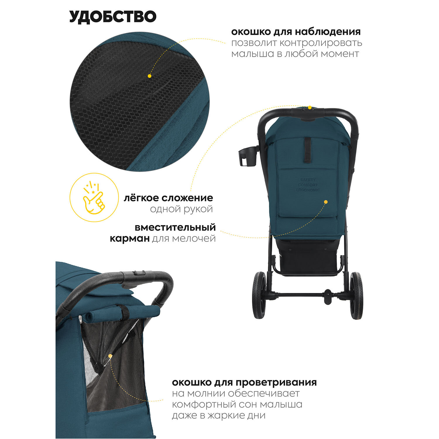 | Капюшон | капюшон опускается до бампера, карман на капюшоне, материал с УФ-защитой, смотровое окно |
