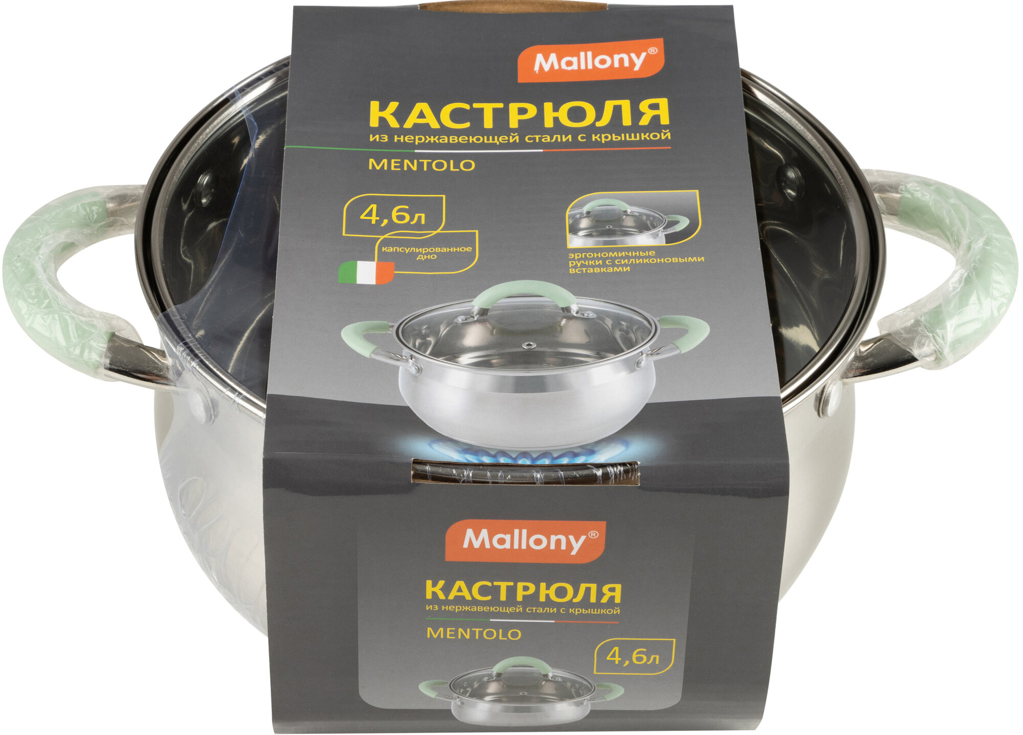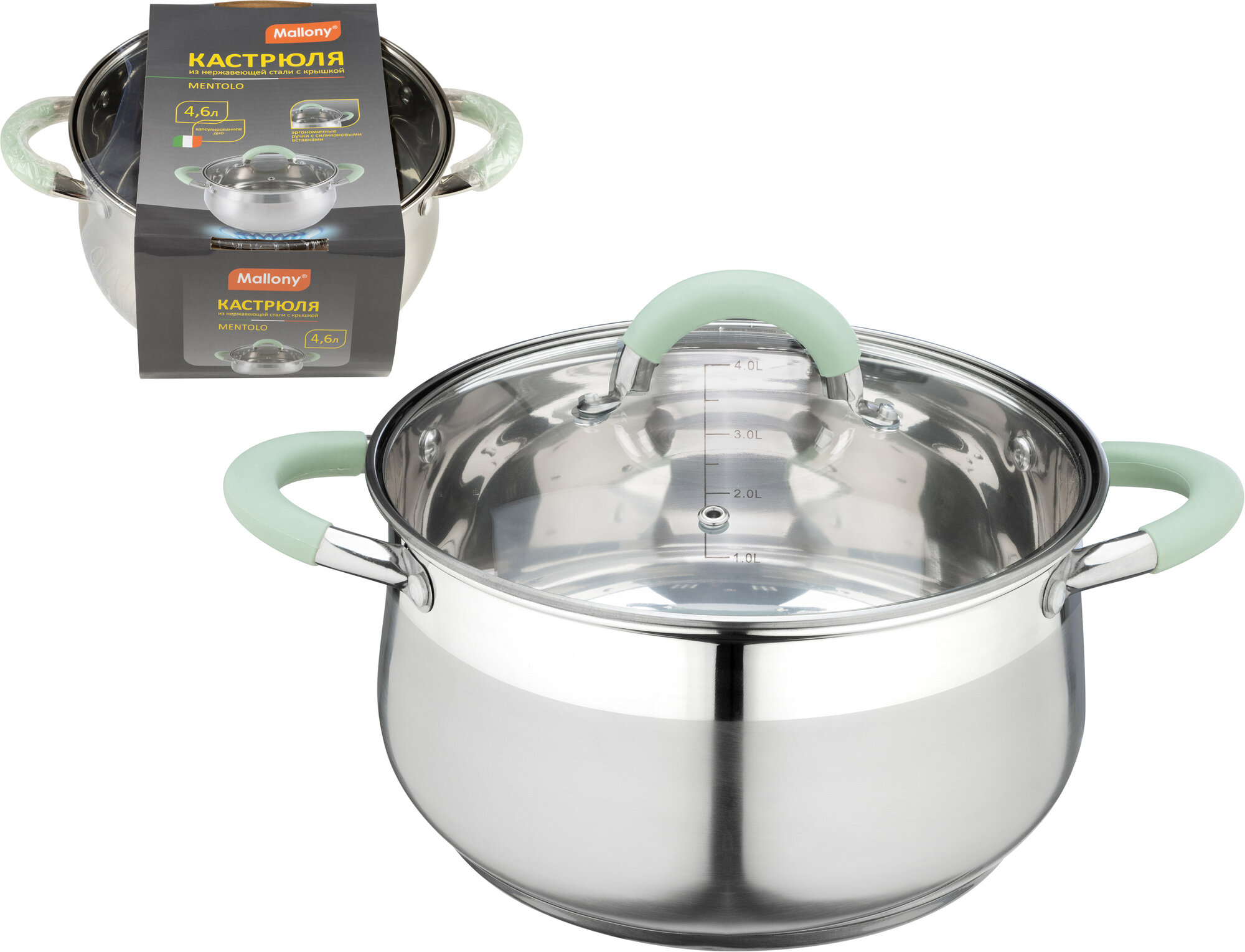 Mallony Кастрюля Mentolo, 4,6 л, из нержавеющей стали с крышкой, ручки с силиконом (103578) .
