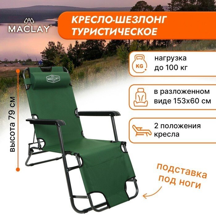 Кресло-шезлонг туристическое с подголовником, 153 х 60 х 79 см, до 100 кг, цвет зелёный Maclay 13415 .